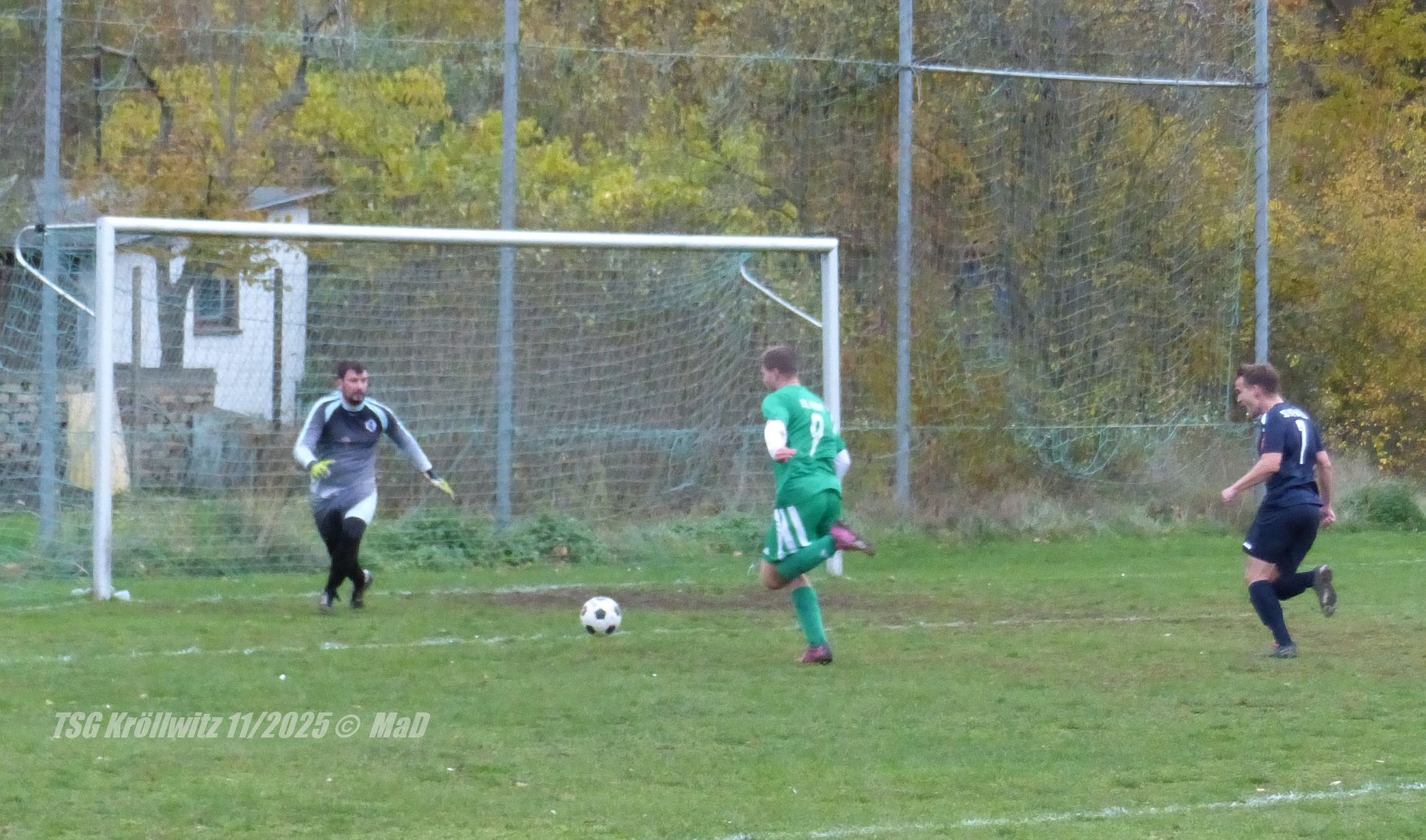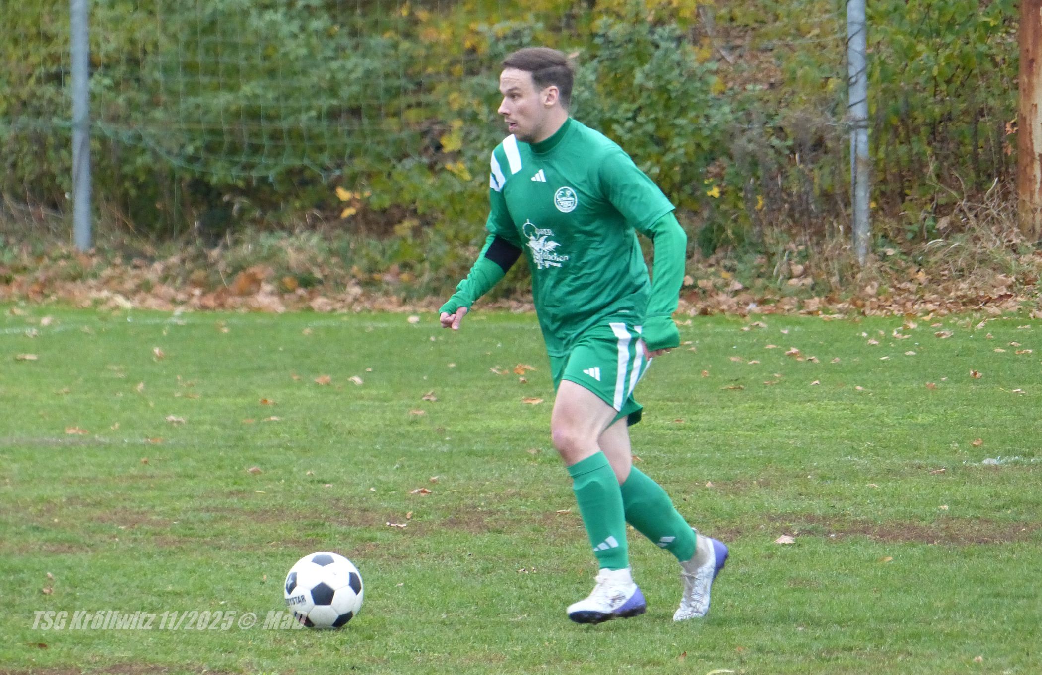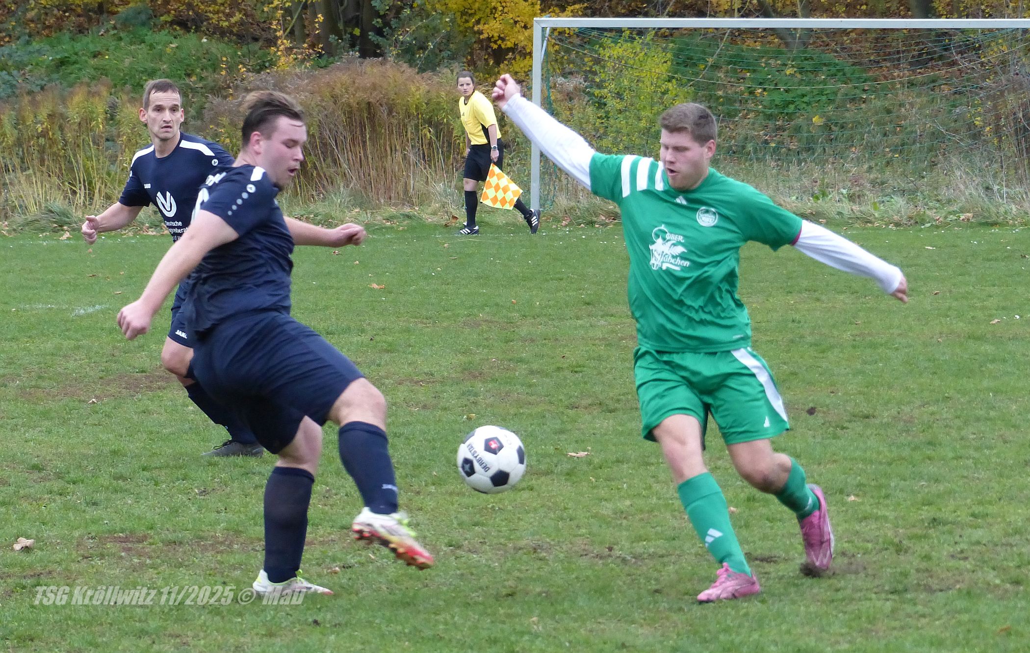 Auch in Hälfte zwei ging es bisweilen sehr ruppig zu. Einer, der das immer wieder schmerzhaft zu spüren bekam, war Kevin H. Nach einem erneuten Foul so um die 30 Meter vor dem Tor, hatte er dann wohl genug. Den fälligen Freistoß nahm er sich selbst und verwandelte mit direktem Schuss neben den langen Pfosten. Danach waren die Messen eigentlich gesungen. Mit etwas mehr Kaltschnäuzigkeit, hätte Kröllwitz sogar das eine oder andere Tor nachlegen können. Bestes Beispiel dafür war der eingewechselte Tom B., der in der 90. Minute allein auf den Keeper zulaufen konnte, aber letztlich nicht netzten konnte. Egal. Drei wichtige Punkte gegen einen direkten Konkurrenten im Kampf um den Klassenerhalt.