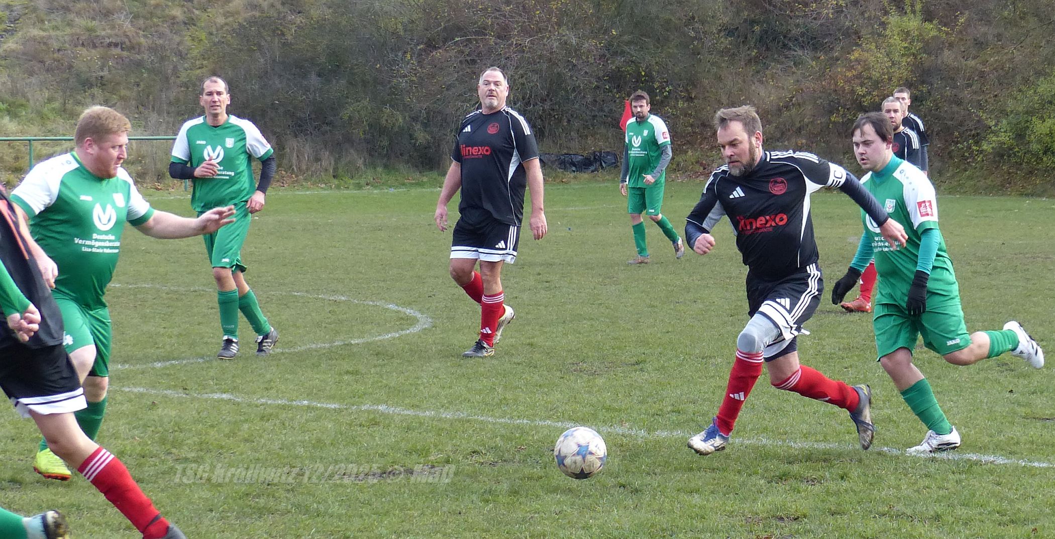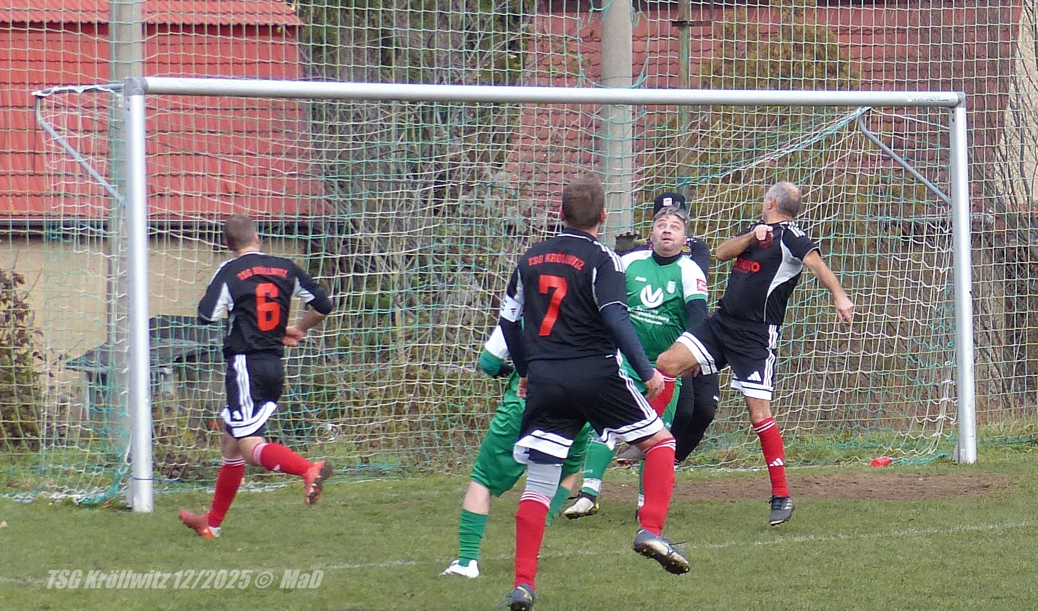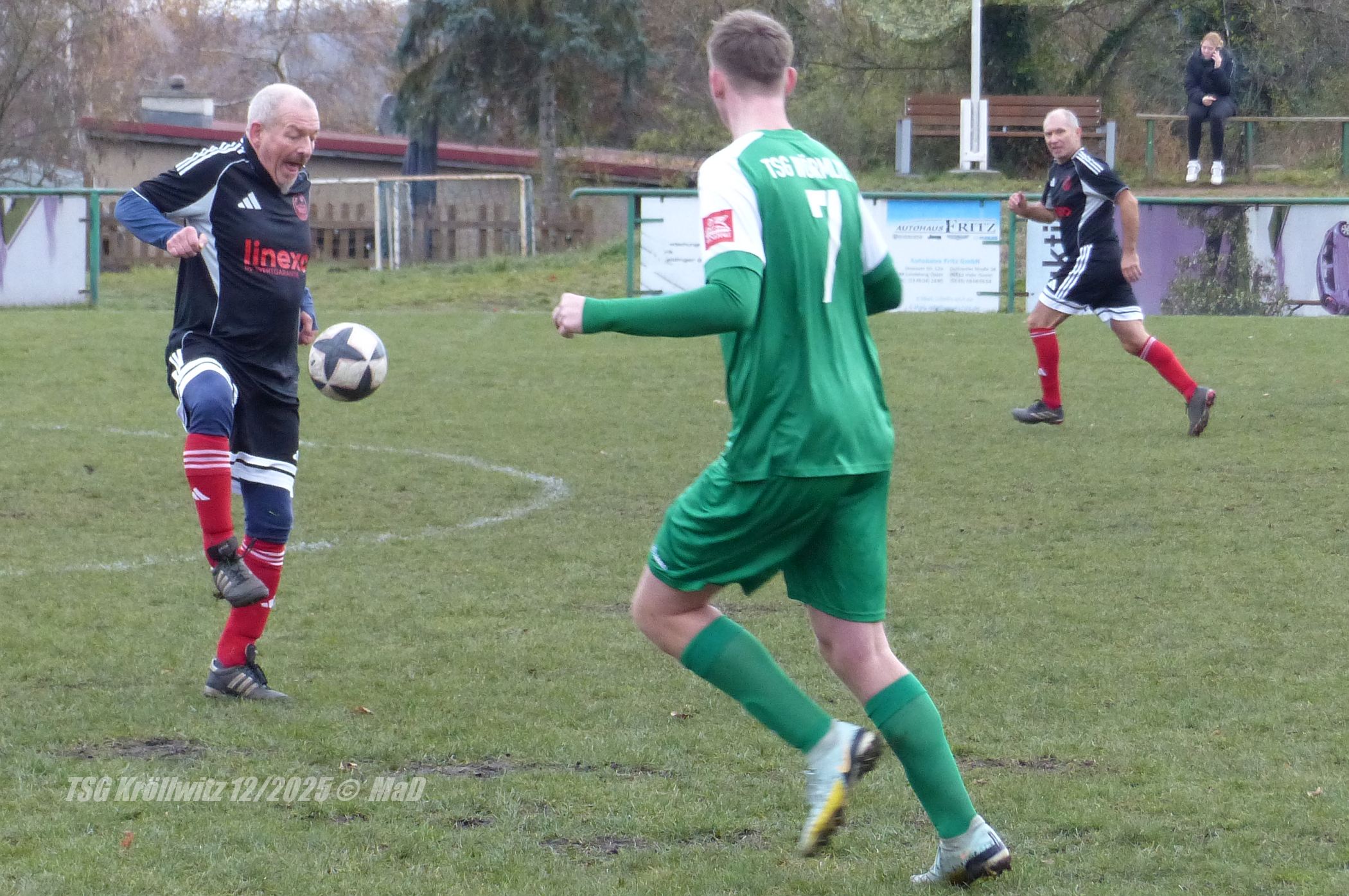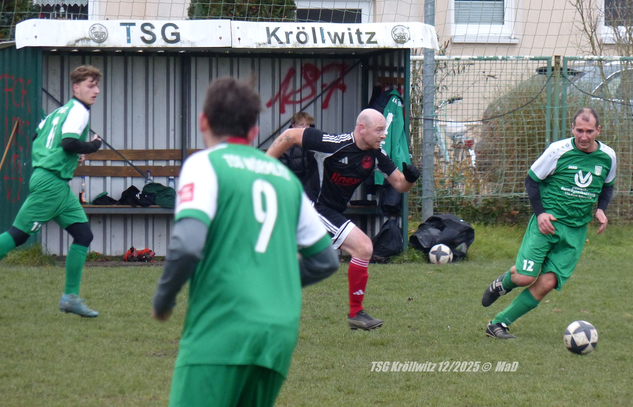 Kurz vor der Pause traf "Icke" zum vorerst erlösenden 1:0, nachdem Martin 5 Minuten zuvor, leichtfertig einen Elfmeter verschossen hatte. Nach dem Seitenwechsel kamen die Gäste dann erstmal zurück. Stamm traf zum zwischen zeitlichen und nicht unverdienten 1:1-Ausgleich. Doch auch bei den Gästen sollte sich dann die "kurze" Bank durch zunehmend schwindende Kräfte bemerkbar machen. Dem Kröllwitzer Kapitän Dr. David M. war es dann vergönnt, nach feinem Steilpass von Abwehrchef Ralf, den Gästekeeper per gefühlvollem Lupfer zum 2:1 zu überwinden. Von beiden Kröllwitzer Akteuren sehr gelungene und nicht alltägliche "Moves" - Respekt und Gratulation! Den Schlusspunkt setzte dann Alex mit dem sicher verwandelten Handelfmeter in der letzten Spielminute zum 3:1-Endstand. (TSG/mad)