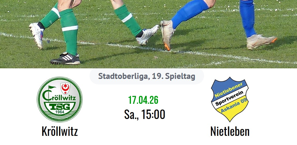 Am 19. Spieltag der Stadtoberliga Halle empfangen die Kröllwitzer Herren die Mannen von Askania Nietleben. Nachdem die TSG am vergangenen Samstag einen in dieser Höhe nicht unbedingt erwartbaren 4:0-Auswärtssieg in Lettin eingefahren haben, steht nun das Duell gegen den aktuellen ...